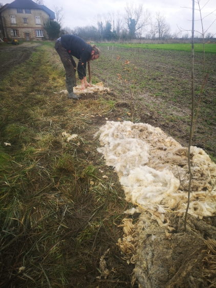 Pour réaliser ce projet, nous avons testé le paillage naturel avec la laine de mouton. Cette technique est encore en cours d'essai en Belgique, mais il tenait à cœur à l'éleveur de la mettre en pratique. C'est chose faite ! La laine de mouton a plusieurs atouts : répulsifs pour les chevreuils sangliers et sans doute rongeurs, elle permet également d'absorber l'eau pour la redistribuer petit à petit. Pour 1kg de laine, 2L d'eau peut être emmagasiné ! Avec les sécheresses estivales il nous tarde de suivre l'évolution de la reprise des plants.